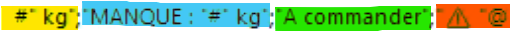 en bleu : si le stock est indisponible (<0) → MANQUE 47 kg