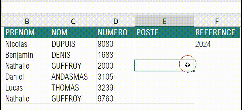 Exemple : créer un numéro de poste complexe. Ici l’idée est de transformer la donnée en combinant du texte (#), une référence fixe (2024), la fonction GAUCHE() pour récupérer les 3 premières lettres du nom et le numéro de pose.