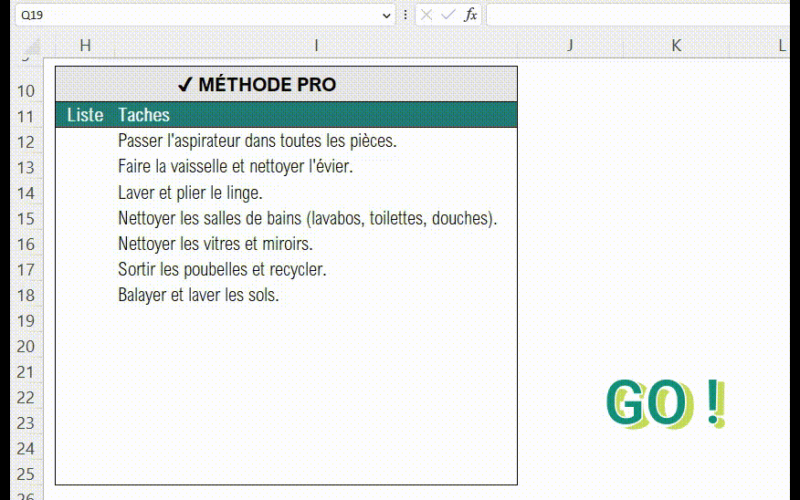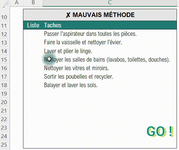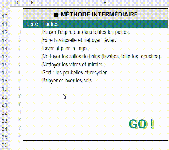 PS : NBVAL compte le nombre de cellules non vides de la colonne I. C’est pour ça que j’ajoute -2 après, pour retirer la cellule avec le “titre” (Méthode Pro) et l’en-tête (Taches).